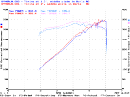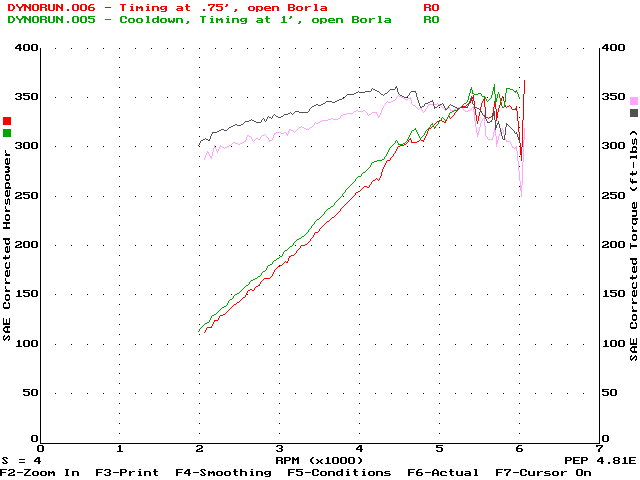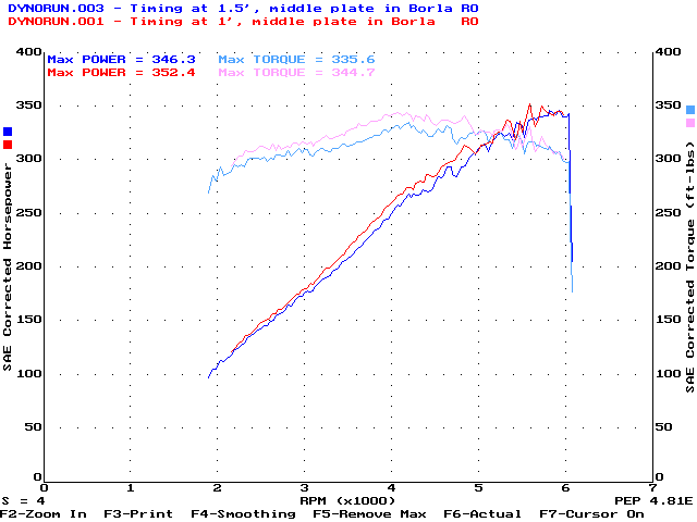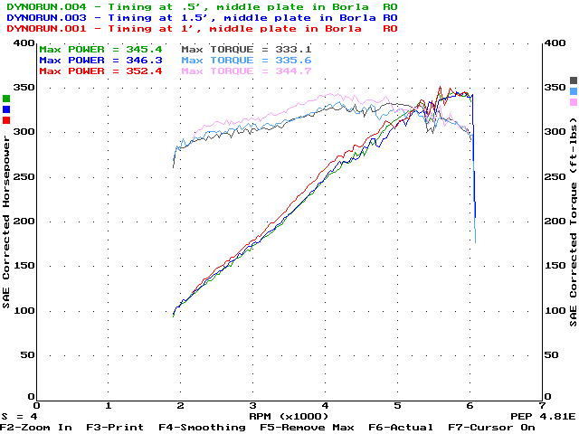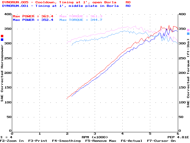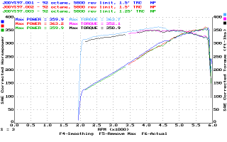 10/23/97 - 363.4hp @ 6000rpm, 357.0ft-lbs@4400rpmDyno runs done at ACS Racing in East Hanover, MA. (Don't go there - they're overpriced, technically-illiterate, dyno jockeys. They know how to run a dyno, but that's about it. If you want to go somewhere in New England, go to Boston Performance Group instead)Car Summary: 7psi Vortech S-Trim, Borla cat-back, Hypertech Blower program, 160' thermostat, 93 octane gas 1/30/99 - 363.2hp @ 5800rpm, 363.7ft-lbs@4300rpmDyno runs done at Superior Dyno Service in Fairfield, CA. Highly recommended dyno as Keith Paulsen knows his stuff technically and is a great guy to work with as well as being reasonably priced.Car Summary: 7psi Vortech S-Trim, Borla cat-back (no plate), stock 95 PCM, 160' thermostat, 92 octane gas